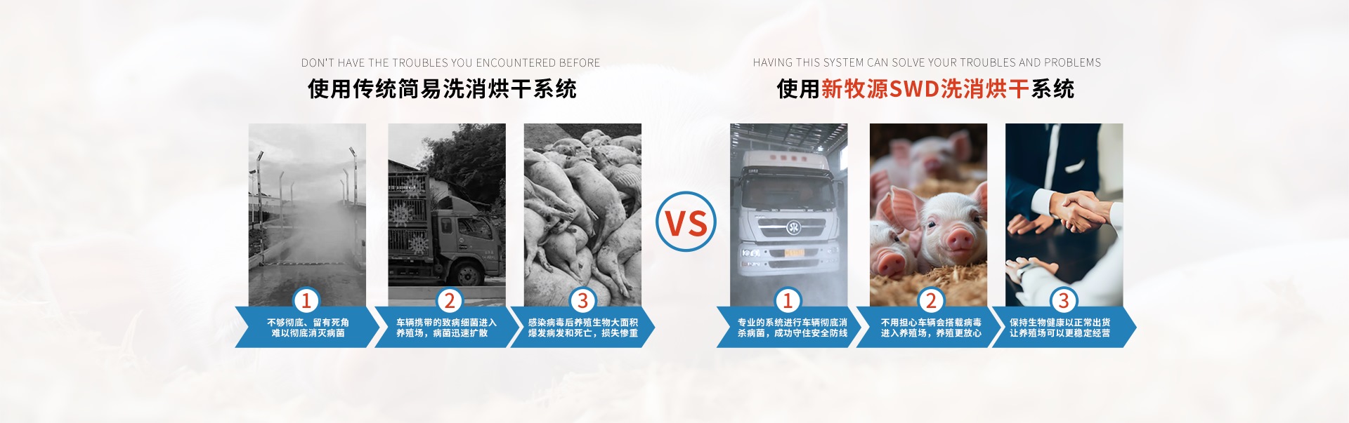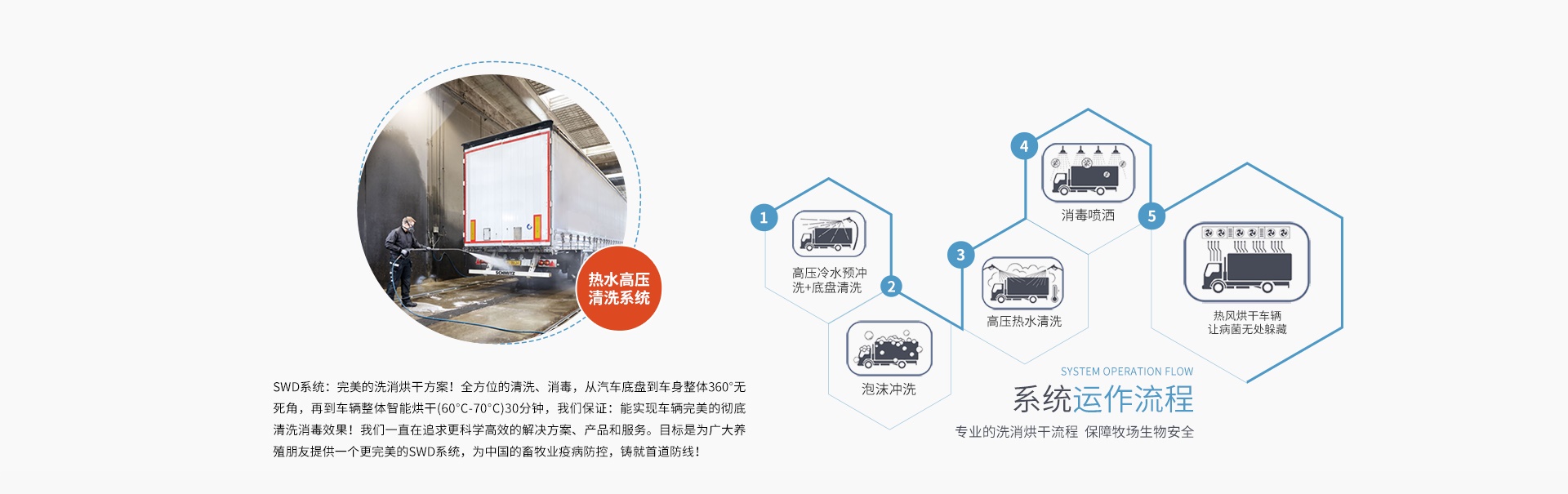 SWD系統:完美的洗消烘干方案!全方位的清洗、消毒,從汽車底盤到車身整體360°無死角,再到車輛整體智能烘干(60℃-70℃)30分鐘,我們保證:能實現車輛完美的徹底清洗消毒效果!我們一直在追求更科學高效的解決方案、產品和服務。目標是為廣大養殖朋友提供一個更完美的SWD系統,為中國的畜牧業疫病防控,鑄就首道防線!